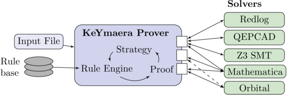 In KeYmaera, verifying correct functioning of hybrid systems amounts to proving corresponding formulas in, what is called, differential dynamic logic dL [4,6]. These formulas state the desired correctness properties of the hybrid systems under consideration, including safety, liveness, reactivity, and controllability properties. For showing that these systems operate as expected, André Platzer has devised a logical verification calculus [4,6].
